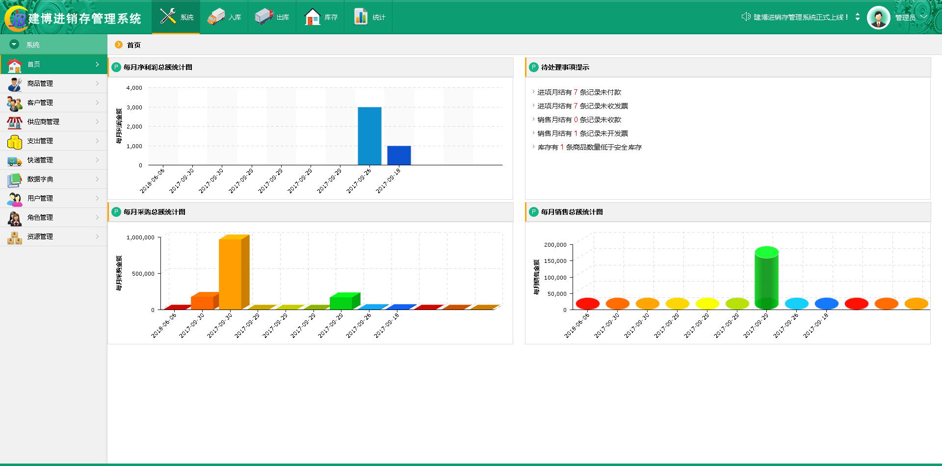 该系统是集进货、销售、存储等多个流程于一体的信息化管理系统。通过自动化的库存平衡,达到出库、入库与支付的流程自动化,提供订单、采购、销售、退货、库存、往来发票、往来账款,实现了资金流、信息流和物流的一体化管理,同时提供丰富的月结统计功能
